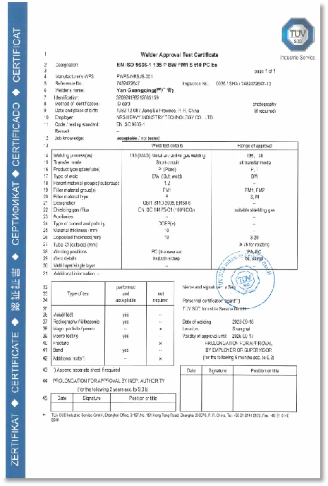 With numerous invention patents and utility model patents, the company employs highly experienced professionals in design, production, and quality control. Many of its welders hold internationally recognized welding operation certificates that meet American and European standards.